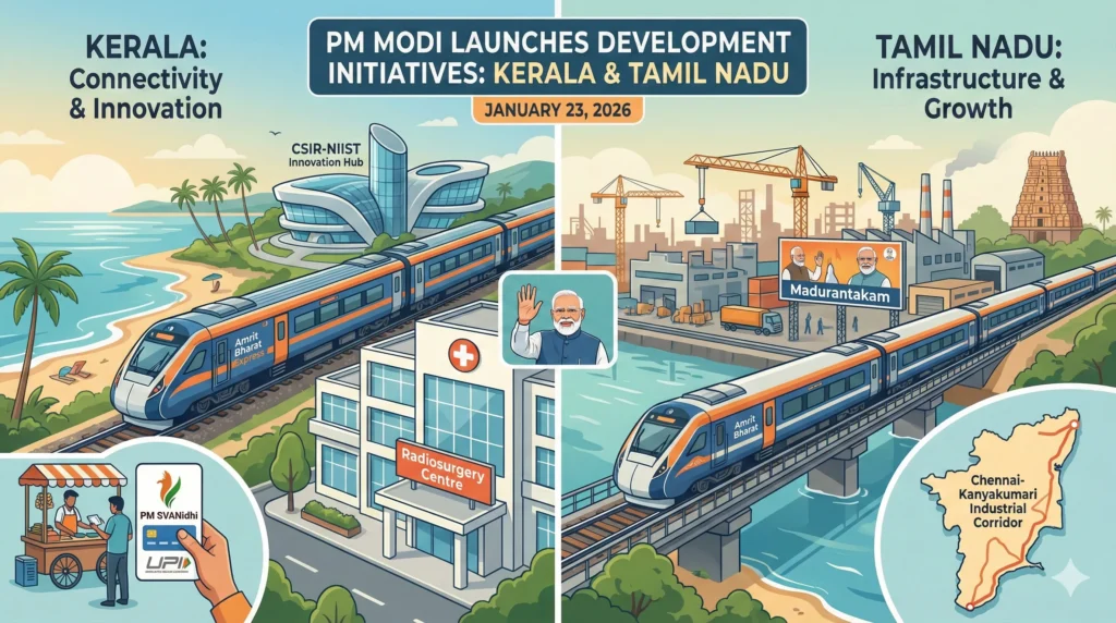 PM Modi Launches Development Initiatives in Kerala & Tamil Nadu. The southern states of India are witnessing a massive infrastructural transformation. On January 23, 2026, Prime Minister Narendra Modi embarked on a significant visit to Kerala and Tamil Nadu, unveiling a slew of development projects aimed at boosting connectivity, healthcare, and urban innovation.