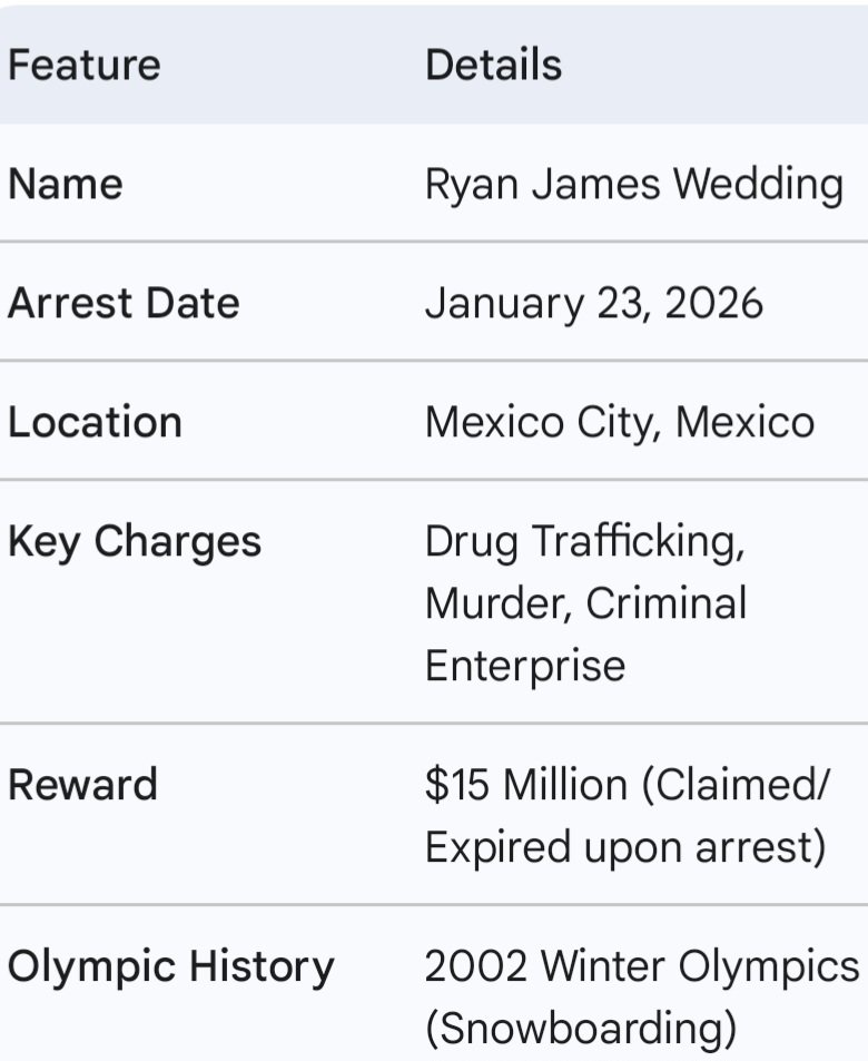 On Thursday, January 23, 2026, federal authorities confirmed that Ryan Wedding was apprehended in Mexico City. The arrest was the result of a coordinated effort between the FBI, US Department of Justice, and Mexican authorities.